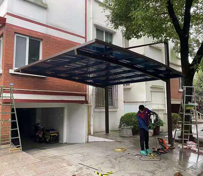 西安英博园艺设计与施工有限公司车棚系列全部采用高品质、高强度铝合金材料精加工而成,具备的氧化保护能力,不生锈,表面特殊的工艺处理,大大提高了车棚的使用寿命。顶棚使用添加了防止紫外线涂层的德国拜耳耐力板,降低了来自紫外线的分解,历久弥新,成就了优越的耐候性。